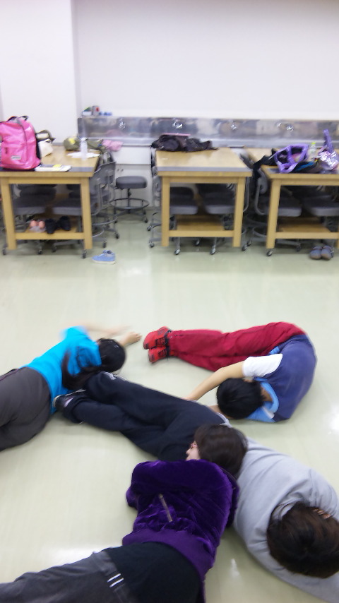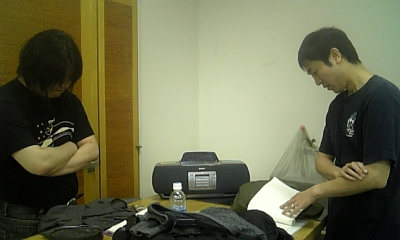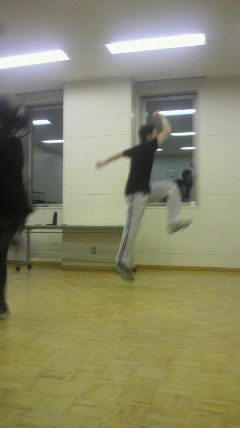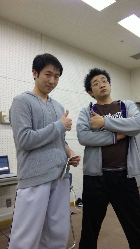 ゴールデンウィーク真っ只中ではありますが、 我々は今日も今日とて稽古でござんす。 稽古開始15分前の18時45分、稽古場に足を踏み入れると、 TEAM音響(左:逸平、右:布田)がなにやら会議中。 その傍らには何枚かのCD、某レンタルショップの赤い袋、そしてCDデッキ。 どうやら、劇中の音楽について検討している様子です。 真剣な面持ちで話し合う2人ですが、そのときCDデッキから流れていた曲は、誰もがよく知る... おっと、これ以上は秘密です。 ソフトボールよりひとまわり?ふたまわり?ほど大きい、発泡スチロールの白玉2個。 本日のウォームアップは、これを使ってみんなでキャッチボール。 ボールの投げ方(肘や手首の角度など)に気を払いながら、ひたすら投げる。 一見遊んでいるかのようですが、これも、次回公演の稽古の一環です。 ボールと友達になることが大切なのです。 『キャプテン翼』の大空翼くんもそう言ってることですし(?)。 今日の稽古は、オムニバス3部作の3作目『Attack! attack! Attack!』の半立ち稽古が中心。 この作品、日常劇といえば日常劇なのですが、 バレーボール(しかもママさんバレー)の話ということで、アクションもかなり多いのです。 これからもっともっとたくさんアクションシーンが出てくることでしょう。 どんな脚本になるか、かなーり楽しみ! 発声練習の合間にピースサインいただきました。 (左:カンノ、右:阿部) 今日も愉快な稽古場です。 なおこ@webmaster